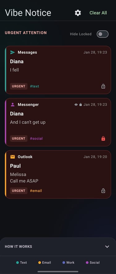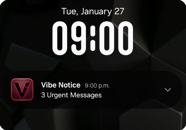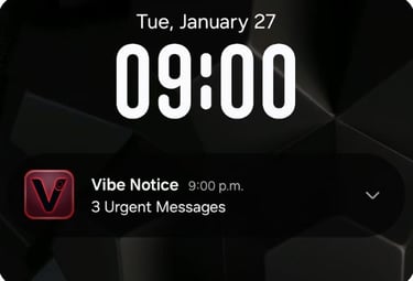 In today's hyper-connected world, notification overload is a daily challenge. When you're receiving dozens of emails and messages across multiple platforms throughout the day, it's easy for critical communications to get lost in the noise. Vibe Notice solves this problem by cutting through the clutter during those brief moments when you check your phone.